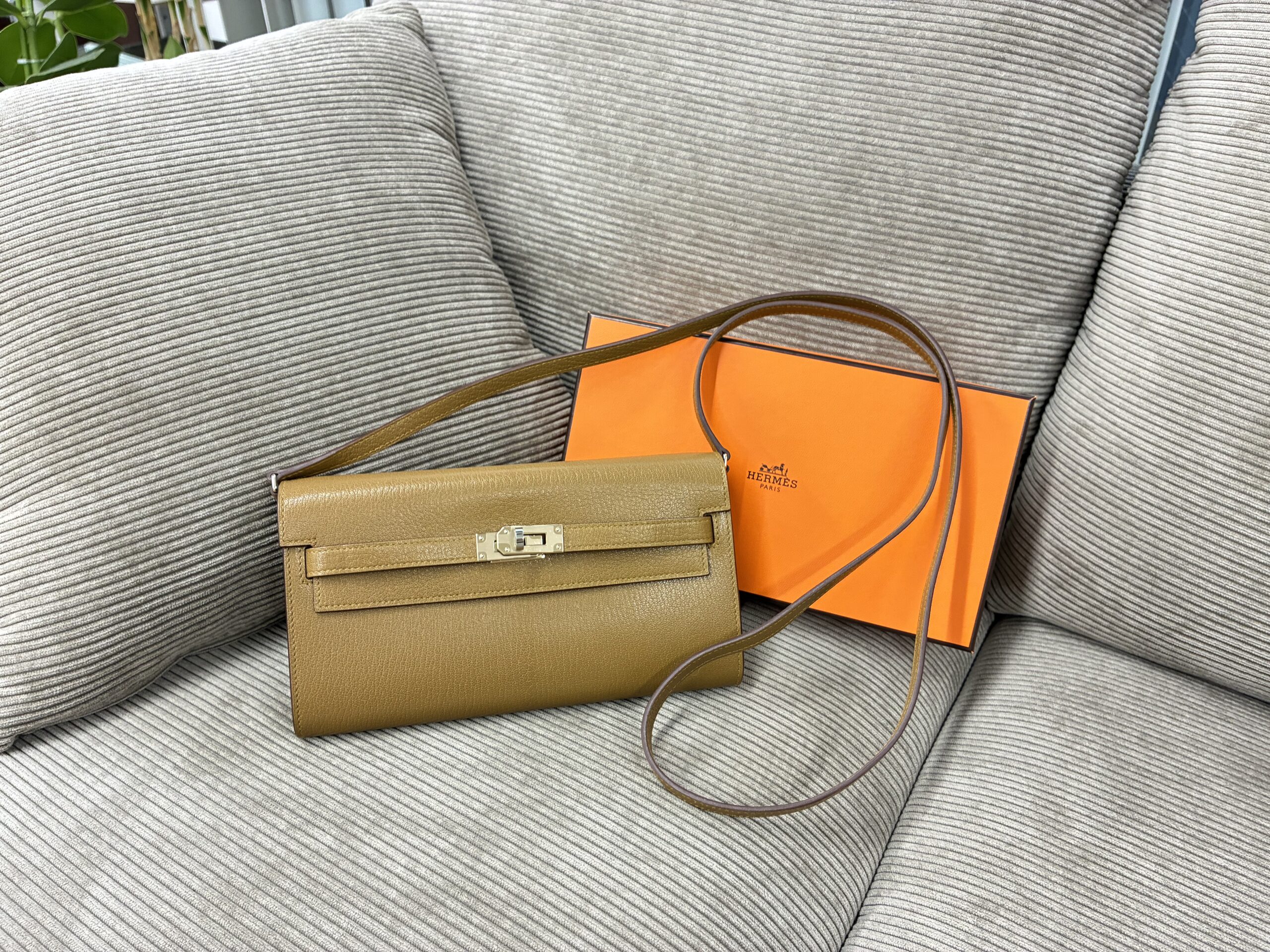 前回ご紹介したケリーバッグと同じ、2色の色の金具の組み合わせのエレクトラム金具が珍しいお品です。お素材はシェーブルシャムキラという山羊革になり、やわらかなツヤと肌触りです。